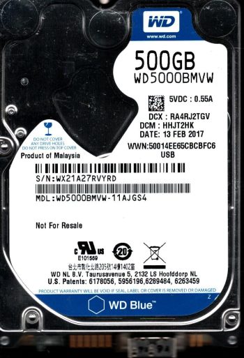Model:WD5000BMVW-11AJGS4 Country of manufacture:MALAYSIA Capacity:500GB Serial number:WX21A27RVYRD DCM:HHJT2HK Date of manufacture:MAR 2017 PCB:2060-771961-001 REV B QR code:771961-S01 SKU:11042