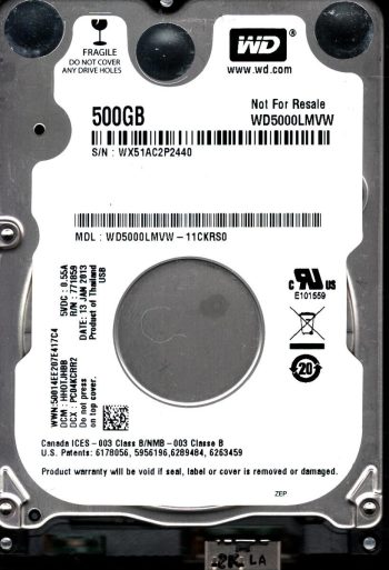 Model:WD5000LMVW-11CKRS0 Country of manufacture:THAILAND Capacity:500GB Serial number:WX51AC2P2440 DCM:HH0TJHBB Date of manufacture:JAN 2013 PCB:2060-771859-000 REV P1 QR code:771859-000 SKU:11043