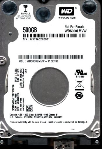 Model:WD5000LMVW-11CKRS0 Country of manufacture:THAILAND Capacity:500GB Serial number:WX71AC2N6931 DCM:HA0TJBBB Date of manufacture:JAN 2013 PCB:2060-771859-000 REV P1 QR code:771859-000 SKU:11044