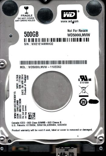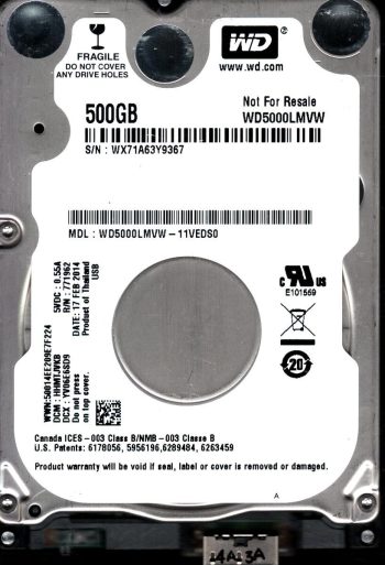 Model:WD5000LMVW-11VEDS0 Country of manufacture:THAILAND Capacity:500GB Serial number:WX71A63Y9367 DCM:HHMTJVKB Date of manufacture:FEB 2014 PCB:2060-771962-002 REV A QR code:771962-002 SKU:11045