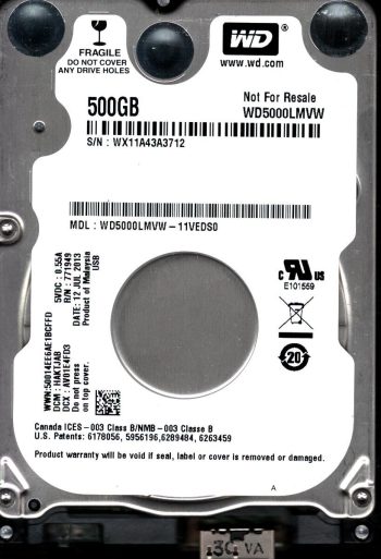 Model:WD5000LMVW-11VEDS0 Country of manufacture:MALAYSIA Capacity:500GB Serial number:WX11A43A3712 DCM:HAKTJAB Date of manufacture:JUL 2013 PCB:2060-771949-000 REV P1 QR code:771949-000 SKU:11046