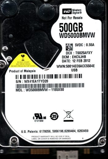 Model:WD5000BMVW-11S5XS0 Country of manufacture:MALAYSIA Capacity:500GB Serial number:WX41EA1TYD20 DCM:EHCVJHB Date of manufacture:FEB 2012 PCB:2060-771801-002 REV P1 QR code:771801-002 SKU:11047