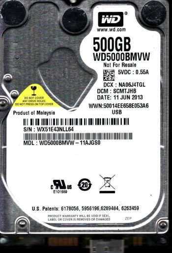 Model:WD5000BMVW-11AJGS0 Country of manufacture:MALAYSIA Capacity:500GB Serial number:WX51E43NLL64 DCM:SCMTJHB Date of manufacture:JUN 2013 PCB:2060-771961-000 REV P1 QR code:771961-F00 SKU:11048