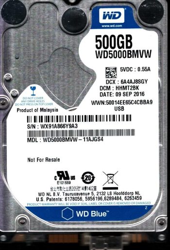 Model:WD5000BMVW-11AJGS4 Country of manufacture:MALAYSIA Capacity:500GB Serial number:WX91A866Y9A3 DCM:HHMT2BK Date of manufacture:SEP 2016 PCB:2060-771961-001 REV B QR code:771961-S01 SKU:11049