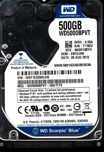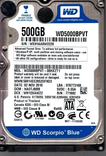 Model:WD5000BPVT-00HXZT1 Country of manufacture:THAILAND Capacity:500GB Serial number:WX91AA0W2229 DCM:HA0TJBBB Date of manufacture:NOV 2010 PCB:2060-771692-005 REV A QR code:771692-105 SKU:11247