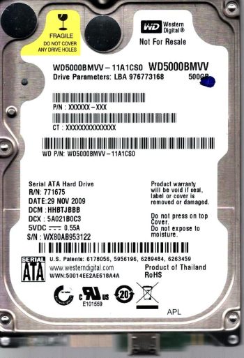 Model: WD5000BMVV-11A1CS0 Country of manufacture:THAILAND Capacity:500GB Serial number:WX80AB953122 DCM:HHBTJBBB Date of manufacture:NOV 2009 PCB:2060-701675-001 REV P1 QR code:2061-701675-001 ACD2 SKU:11176