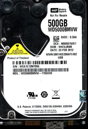 Model:WD5000BMVW-11S5XS0 Country of manufacture:THAILAND Capacity:500GB Serial number:WXA1C12M7055 DCM:HHCVJBNB Date of manufacture:FEB 2012 PCB:2060-771801-002 REV A QR code:2060-771801-002 REV A SKU:11294