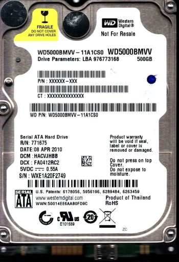 Model:WD5000BMVV-11A1CS0 Country of manufacture:THAILAND Capacity:500GB Serial number:WXE1A20F2749 DCM:HACVJHBB Date of manufacture:MAY 2010 PCB: 2060-701675-004 REV P1 QR code:2061-701675-604 SKU:11561