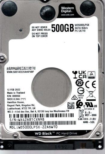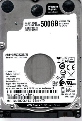 Model:WD5000LPSX-22A6WT0 Country of manufacture:THAILAND Capacity:500GB Serial number:WX52A41K3H4V Date of manufacture:MAR 2022 PCB:2060-800066-006 REV P1 QR code:8000066-206 SKU:11626