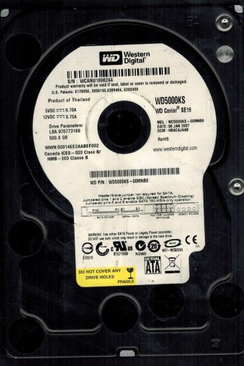 Model:WD5000KS-00MNB0 Country of manufacture:THAILAND Capacity:500GB Serial number:WCANU1898244 DCM:HBACAJAAB Date of manufacture:JAN 2007 PCB:2060-701383 001 REV A SKU:10468