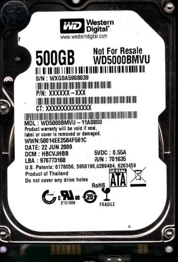 Model:WD5000BMVU-11A08S0 Country of manufacture:THAILAND Capacity:500GB Serial number:WXG0A59S8039 DCM:HBCVJHBB Date of manufacture:JUN 2009 PCB:2060-701635-001 REV P1 QR code:2061-701635-200 AA SKU:10820