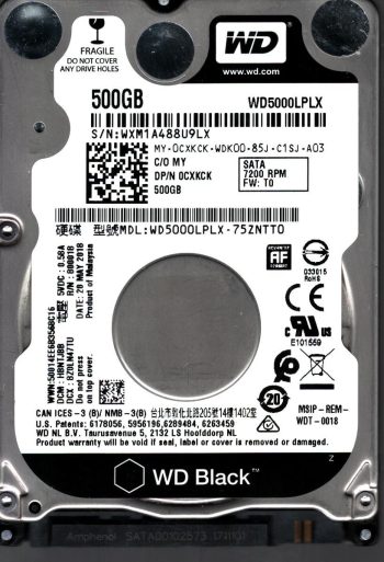 Model:WD5000LPLX-75ZNTT0 Capacity:500GB Serial number:WXM1A488U9LX DCM:HBNTJBB Date of manufacture:MAY 2018 Country of manufacture:MALAYSIA QR code:2060-800018-001 REV P1 SKU:11717