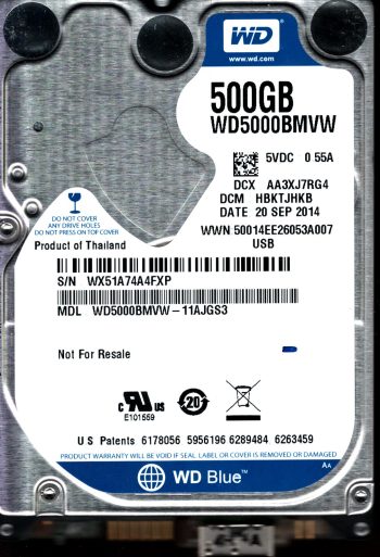 Model:WD5000BMVW-11AJGS3 Capacity:500GB Serial number:WX51A74A4FXP DCM:HBKTJHKB Date of manufacture:SEP 2014 Country of manufacture:THAILAND PCB:2060-771961-001 REV A SKU:12000