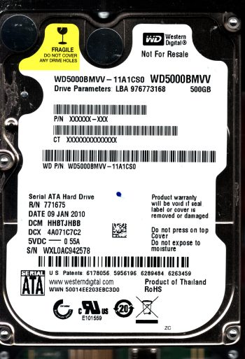 Model:WD5000BMVV-11A1CS0 Country of manufacture:THAILAND Capacity:500GB Serial number:WXG0A99U2149 DCM:HHCTJHBB Date of manufacture:OCT 2009 PCB:2060-701675-001 REV P1 QR code: 2061-701675-001 03PD4 SKU:10871