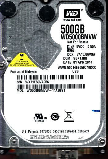 Model:WD5000BMVW-11AJGS2 Country of manufacture:THAILAND Capacity:500GB Serial number:WX61EC3AMXE3 DCM:EBMTJHBB Date of manufacture:MAY 2014 PCB:2060-771961-001 REV A QR code:771961-G01 SKU:10859