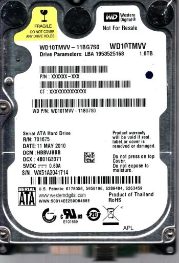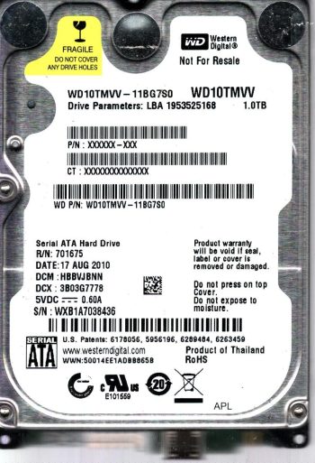 Model:WD10TMVV-11BG7S0 Country of manufacture:THAILAND Capacity:1TB Serial number:WX51A3041714 DCM:HBBVJBBB Date of manufacture:MAY 2010 PCB:Â 2060-701675-004 REV P1 QR code:2061-701676-304 03PÂ SKU:11131
