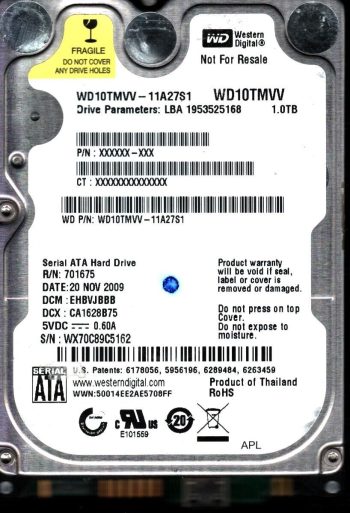 Model:WD10TMVV-11A27S1 Country of manufacture:THAILAND Capacity:1TB Serial number:WX70C89C5162 DCM:EHBVJBBB Date of manufacture:NOV 2009 PCB:2060-701675-001 REV P1 QR code:2061-701675-201 AB SKU:11159