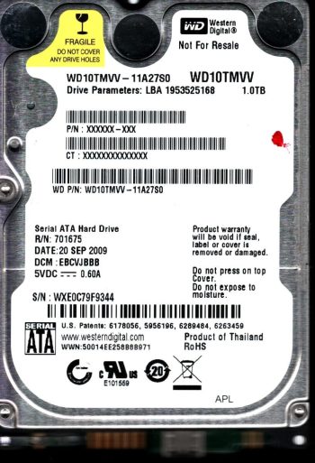 Model:WD10TMVV-11A27S0 Country of manufacture:THAILAND Capacity:1TB Serial number:WXE0C79F9344 DCM:EBCVJBBB Date of manufacture:SEP 2009 PCB:2060-701675-001 REV P1 QR code:2061-701675-201 03P SKU:11280