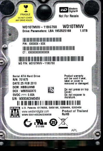 Model:WD10TMVV-11BG7S0 Capacity:1TB Serial number:WXB1A7038436 DCM:HBBVJBNN Date of manufacture:AUG 2010 Country of manufacture:THAILAND PCB:2060-701675-004 REV P1 QR code:2061-701676-304 08P SKU:11787