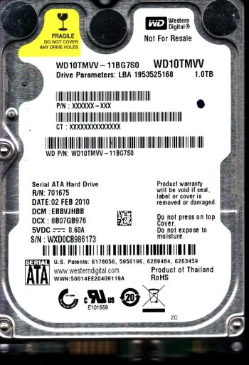 Model:WD10TMVV-11BG7S0 Country of manufacture:THAILAND Capacity:1TB Serial number:WXD0CB986173 DCM:EBBVJHBB Date of manufacture:FEB 2010 PCB:2060-701675-004 REV P1 QR code:2061-701675-304 01P SKU:11283
