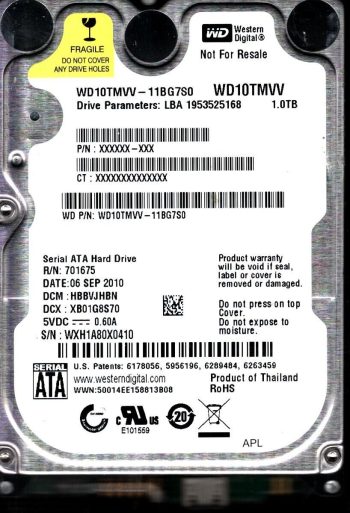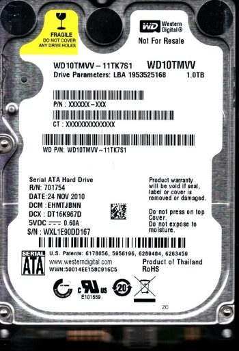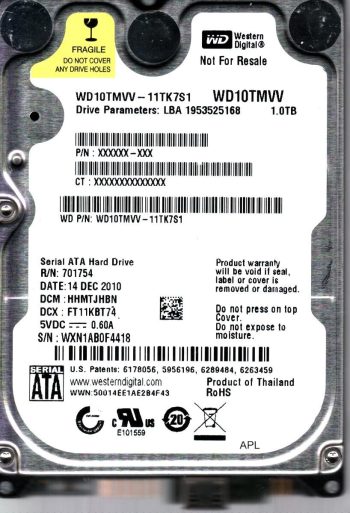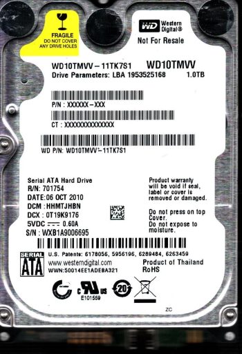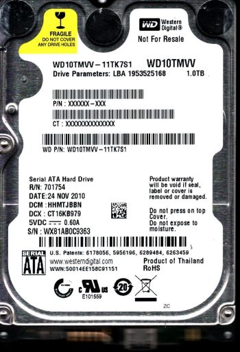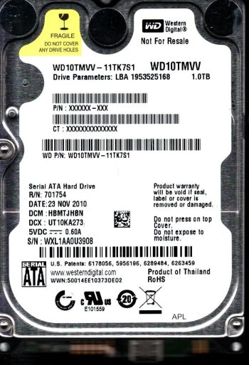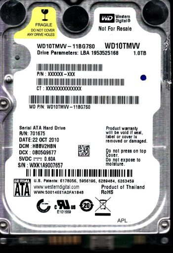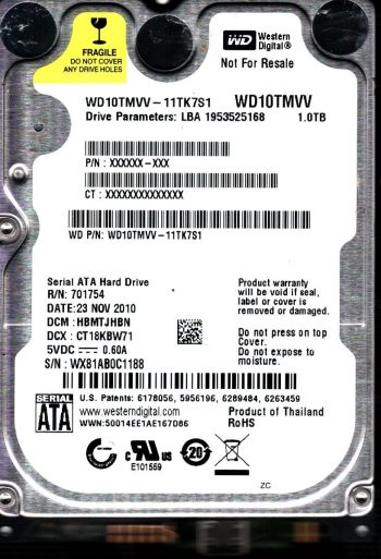 Model:WD10TMVV-11TK7S1 Country of manufacture:THAILAND Capacity:1TB Serial number:WXL1AA0U3908 DCM:HBMTJHBN Date of manufacture:NOV 2010 PCB:2060-771754-000 REVP1 QR code:701754-500 SKU:10818