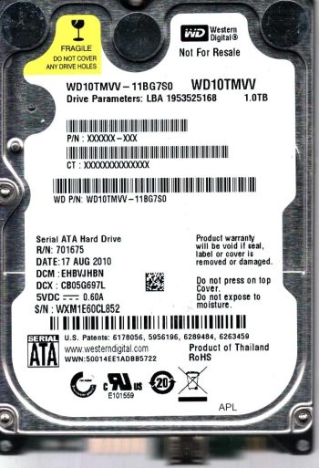 Model:WD10TMVV-11BG7S0 Capacity:1TB Serial number:WXM1E60CL852 DCM:EHBVJHBN Date of manufacture:AUG 2010 Country of manufacture:THAILAND PCB:2060-701675-004 REV P1 QR code:2061-701675-304 06P SKU:11764