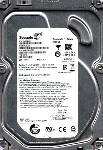 Model:ST2000DL003 Country of manufacture:CHINA Capacity:2TB Serial number:6YD0LSSE Date of manufacture:MAY 2011 PCB:100617465 REV B QR code:2008 F Part number:9VT166-570 SKU:11009