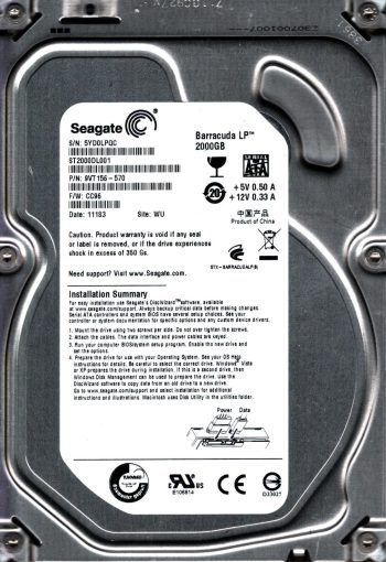 Model:ST2000DL001 Capacity:2TB Serial number:5YD0LPQC Date of manufacture:11183 Country of manufacture:CHINA PCB:100617465 REV A QR code:2060 D Part number:9VT156-570 SKU:11210
