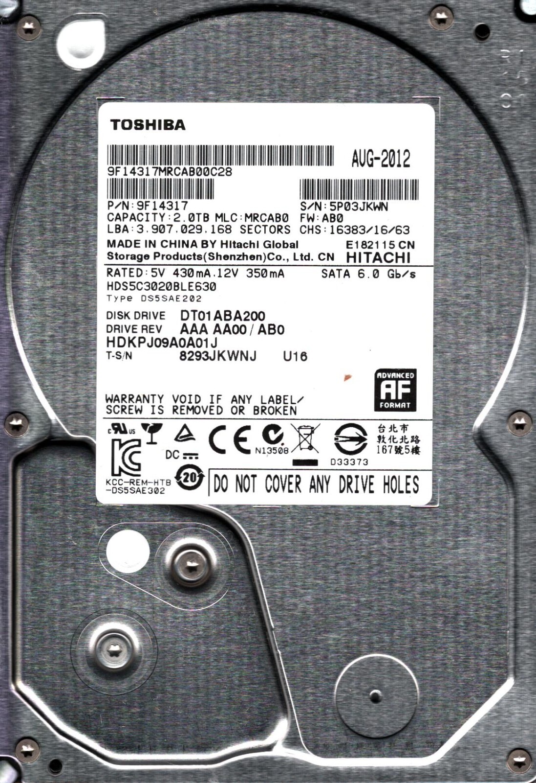 DT01ABA200 HDS5C3020BLE630 P/N: 9F14317 S/N: 5P03JKWN 2TB AUG 2012 CHINA TOSHIBA