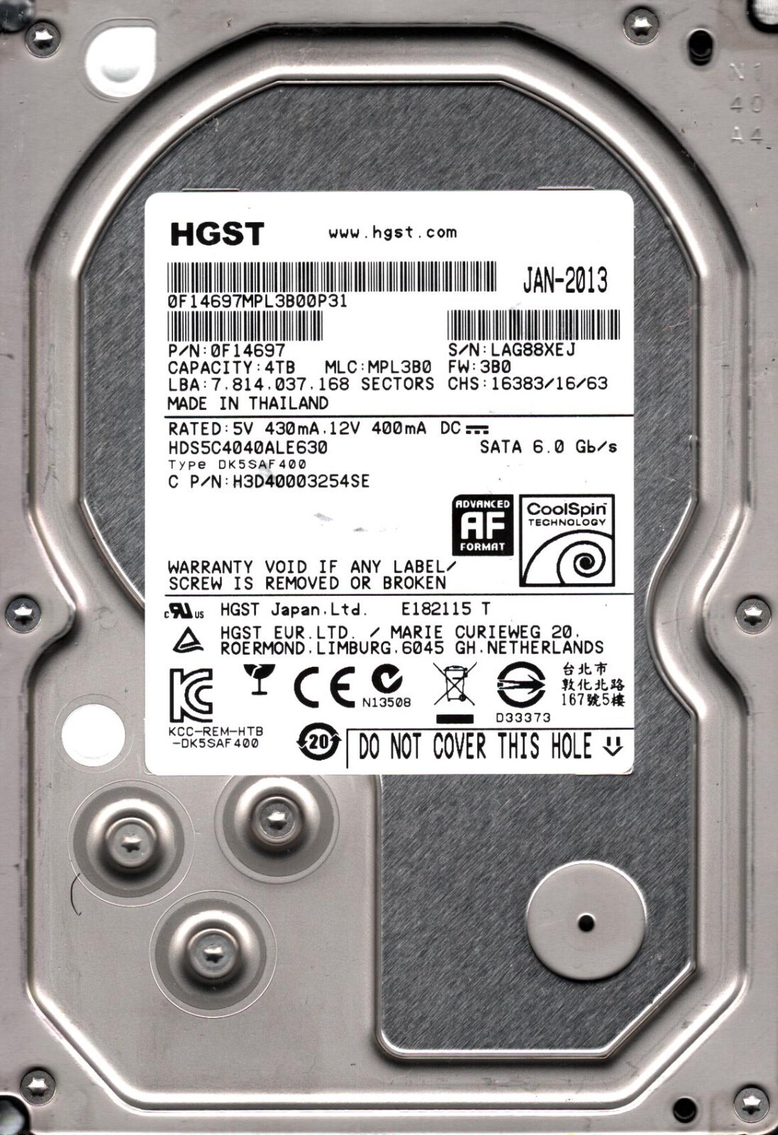 HDS5C4040ALE630 P/N: 0F14697 MLC: MPL3B0 S/N: LAG8 THAILAND JAN 2013 HGST 4TB