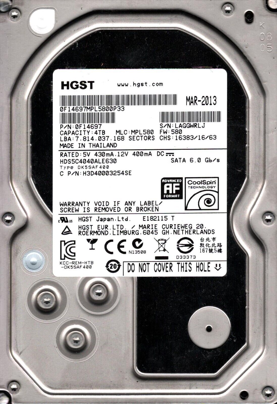 HDS5C4040ALE630 P/N: 0F14697 MLC: MPL580 S/N: LAGG THAILAND MAR 2013 HGST 4TB