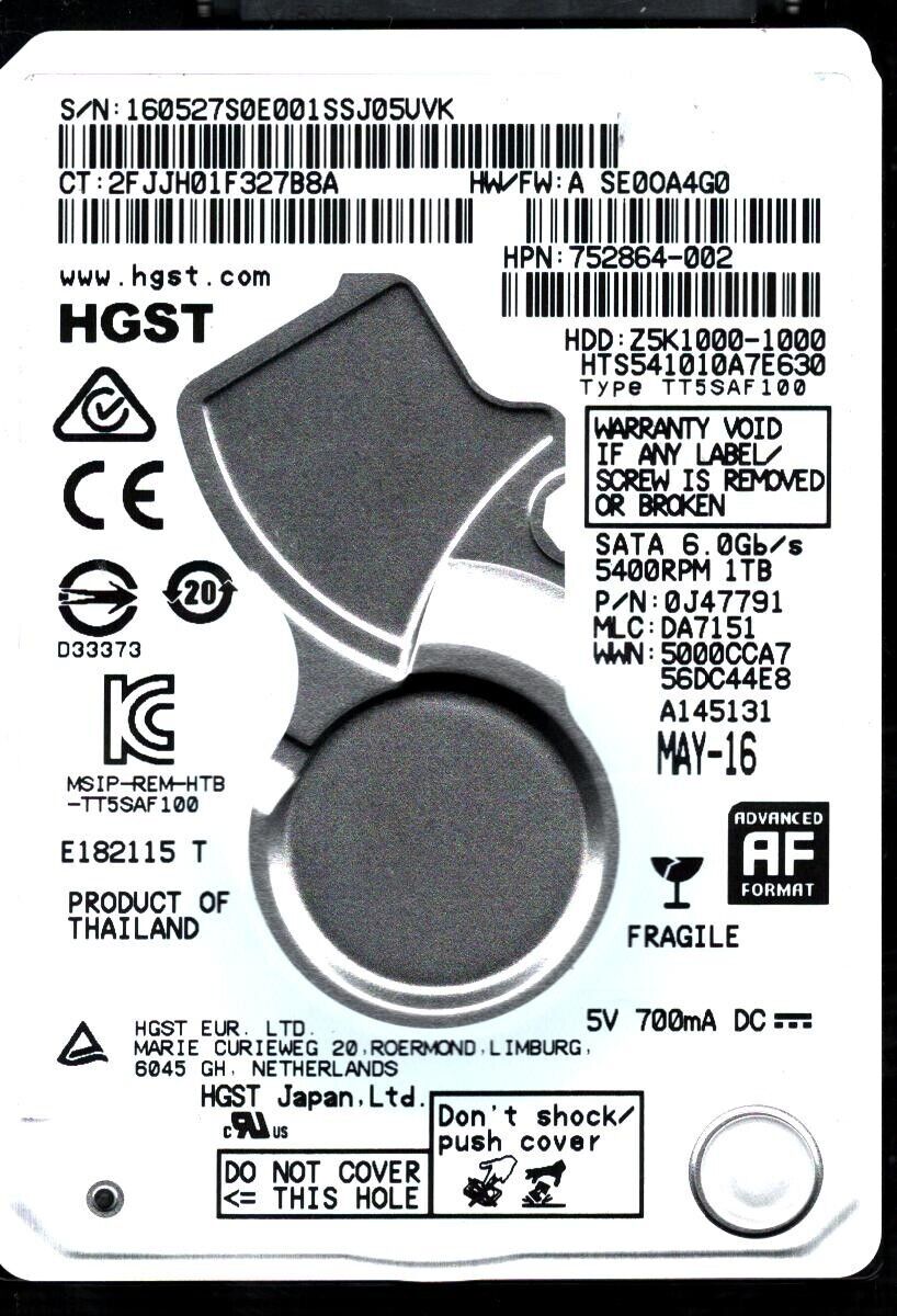 HTS541010A7E630 P/N: 0J47791 MLC: DA7151 THAILAND MAY 2016 HGST 1TB