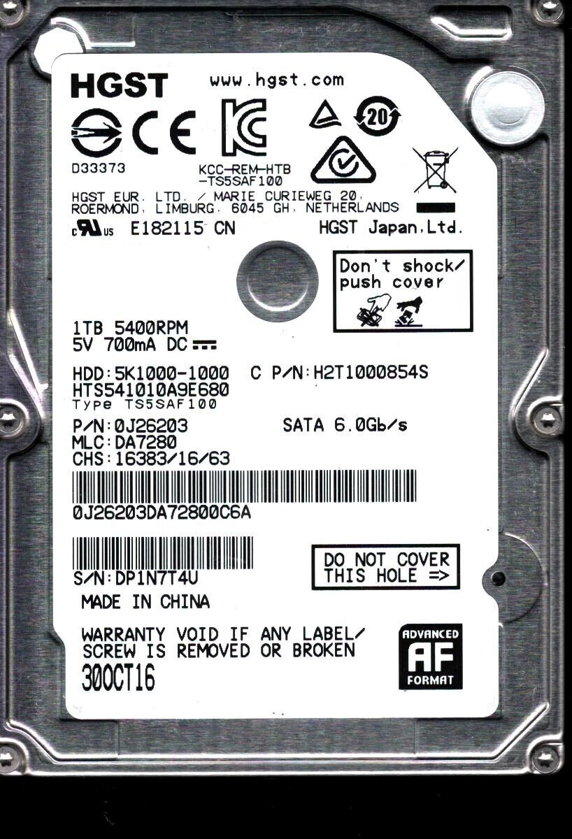HTS541010A9E680 P/N: 0J26203 MLC: DA7280 CHINA OCT 2016 HGST 1TB