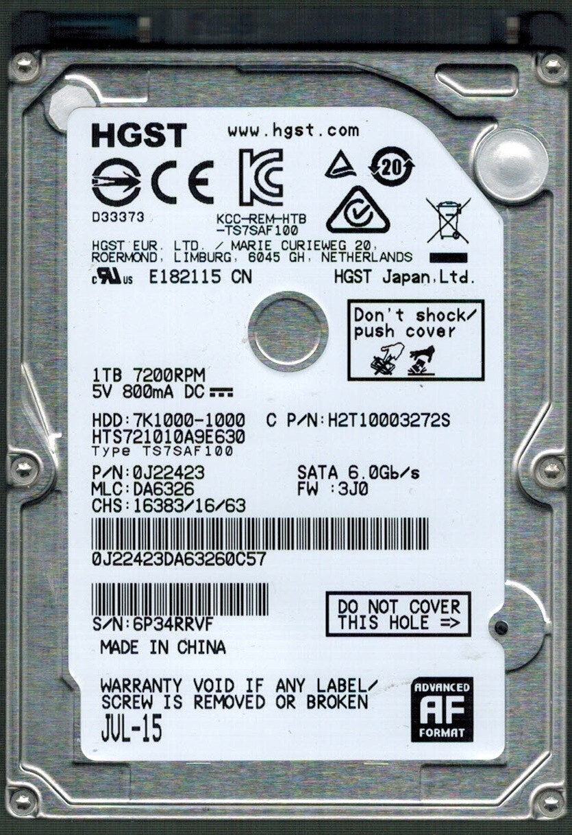 HTS721010A9E630 P/N: 0J22423 MLC: DA6326 CHINA JUL-15 HGST 1TB