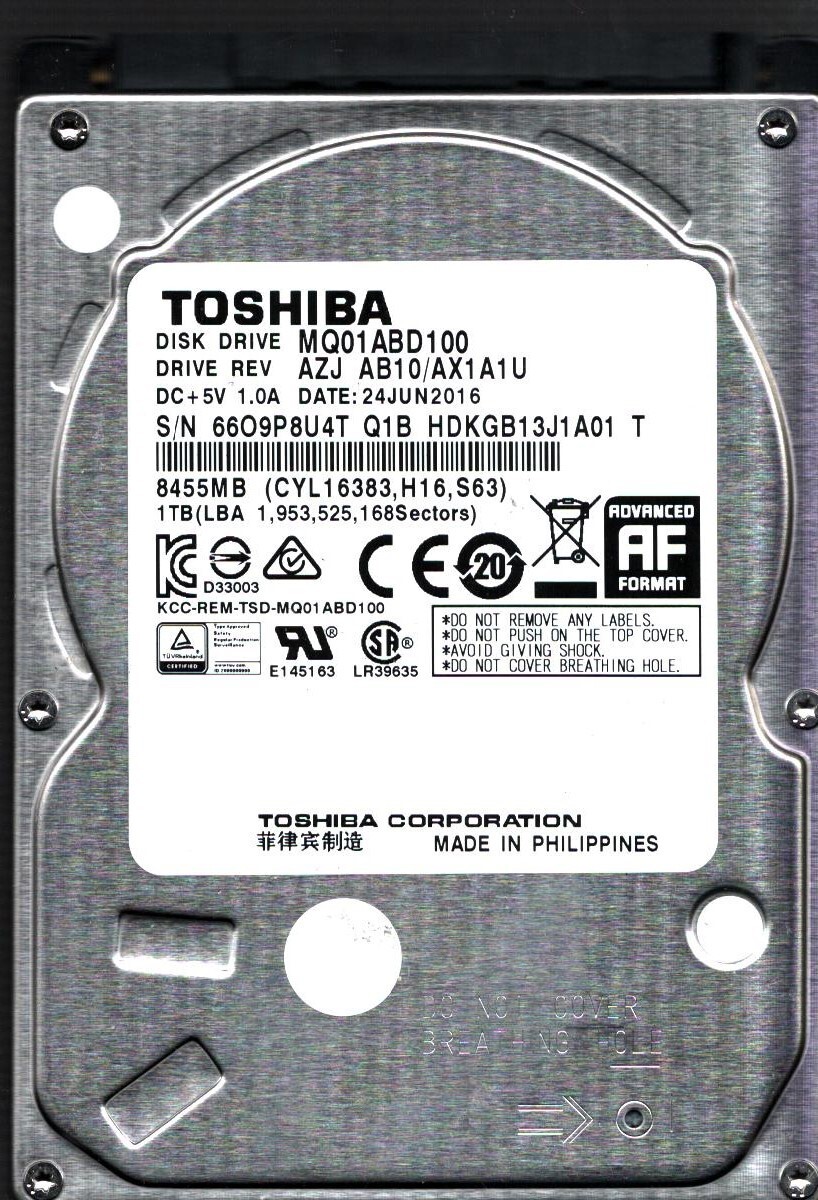 MQ01ABD100 HDKGB13J1A01 T REV: AZJ AB10/AX1A1U 1TB JUN 2016 PHILIPPINES TOSHIBA