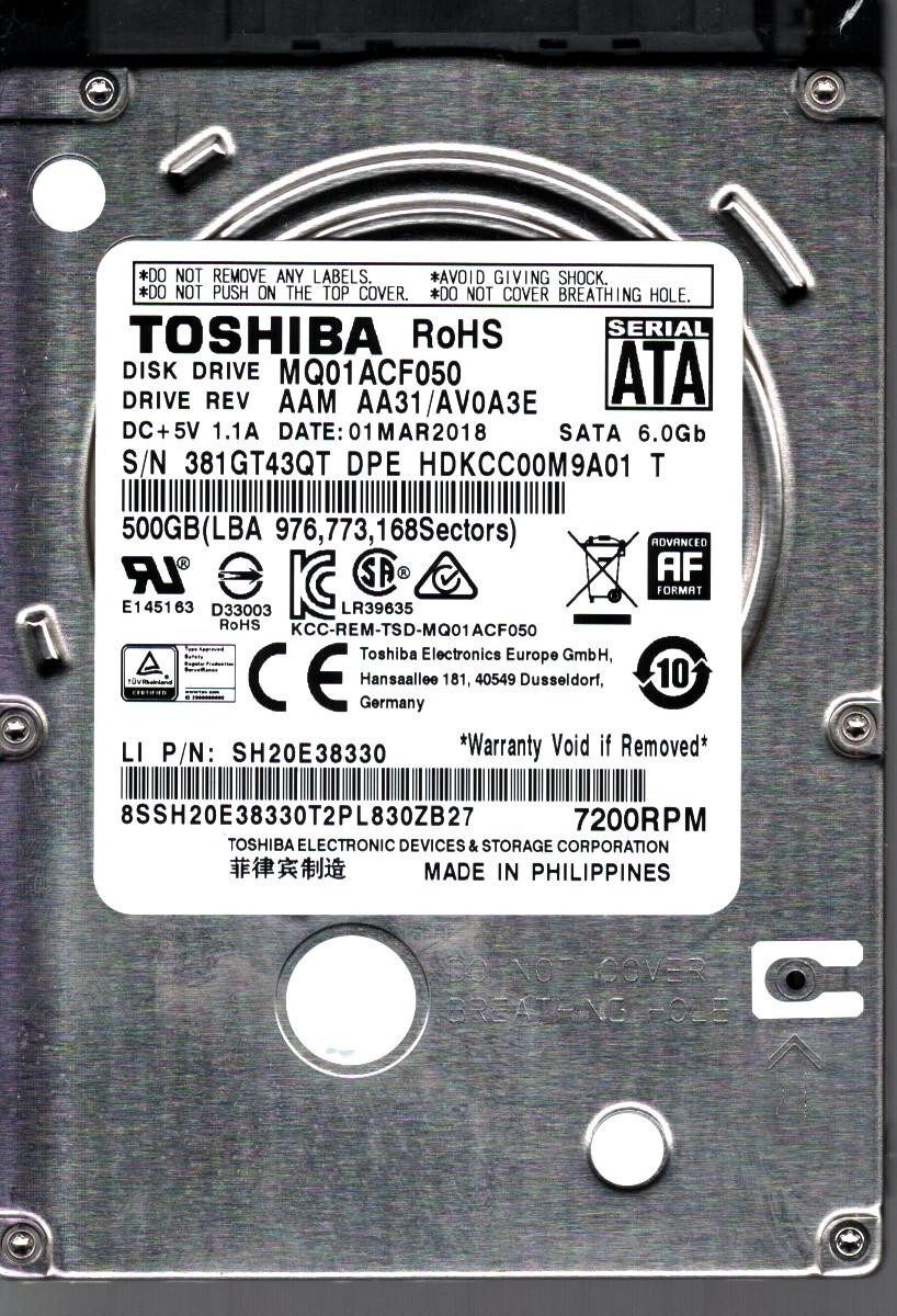 MQ01ACF050 HDKCC00M9A01 T REV:AAM AA31/AV0A3E 500GB MAR 2016 PHILIPPINES TOSHIBA