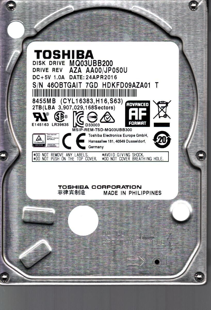 MQ03UBB200 HDKFD09AZA01 T REV:AZA AA00/JP050U 2TB APR 2016 PHILIPPINES TOSHIBA