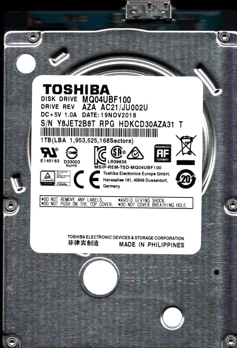 MQ04UBF100 HDKCD30AZA31 T REV: AZA AC21/JU002U 1TB NOV 2018 PHILIPPINES TOSHIBA