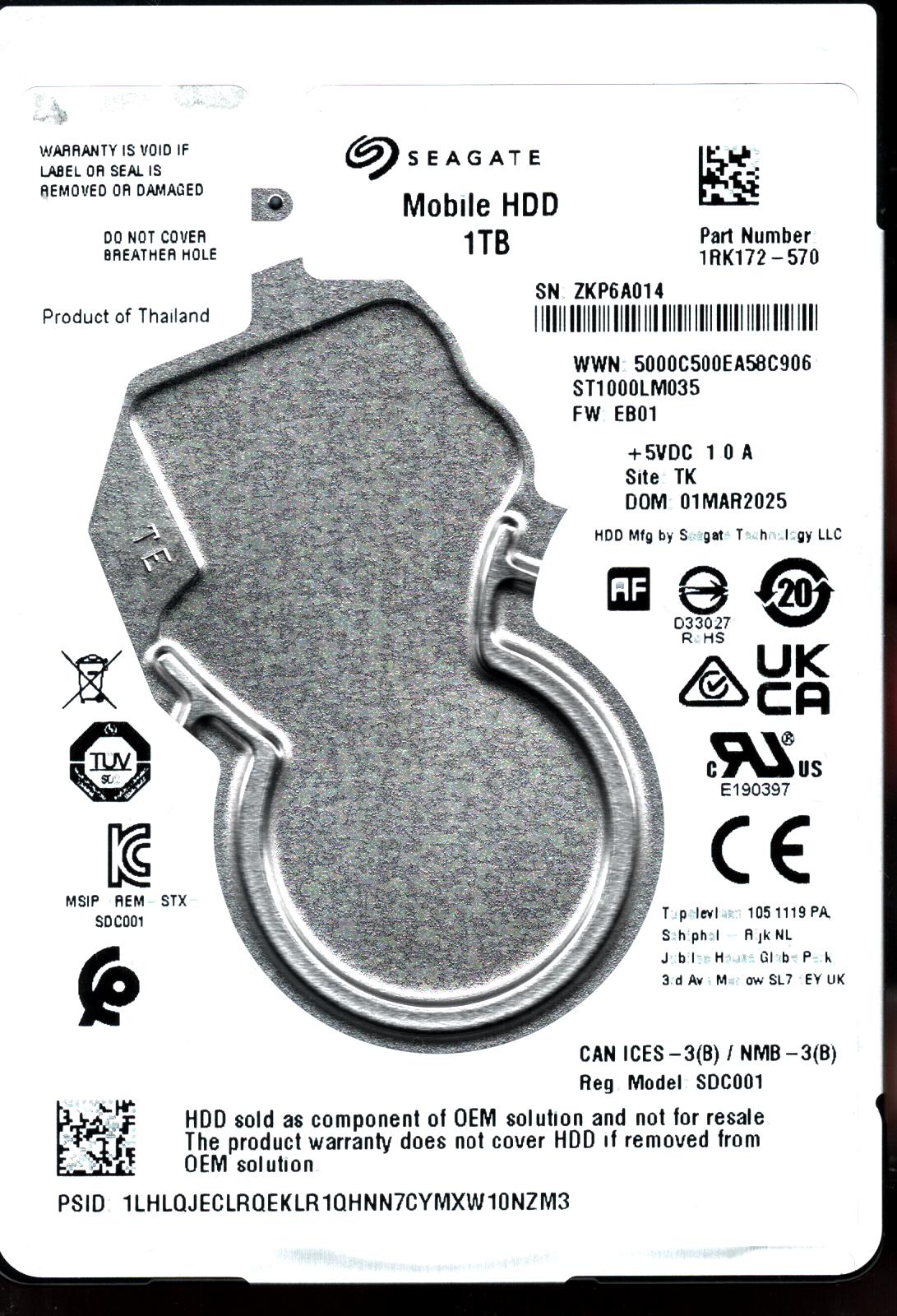 Model:ST3000DM001 Capacity:3TB Serial number:Z1F5QKEE Date of manufacture:11/2014 Country of manufacture:THAILAND PCB:100717520 REV B QR code:100681391 Part number:1CH166-048 SKU:10177