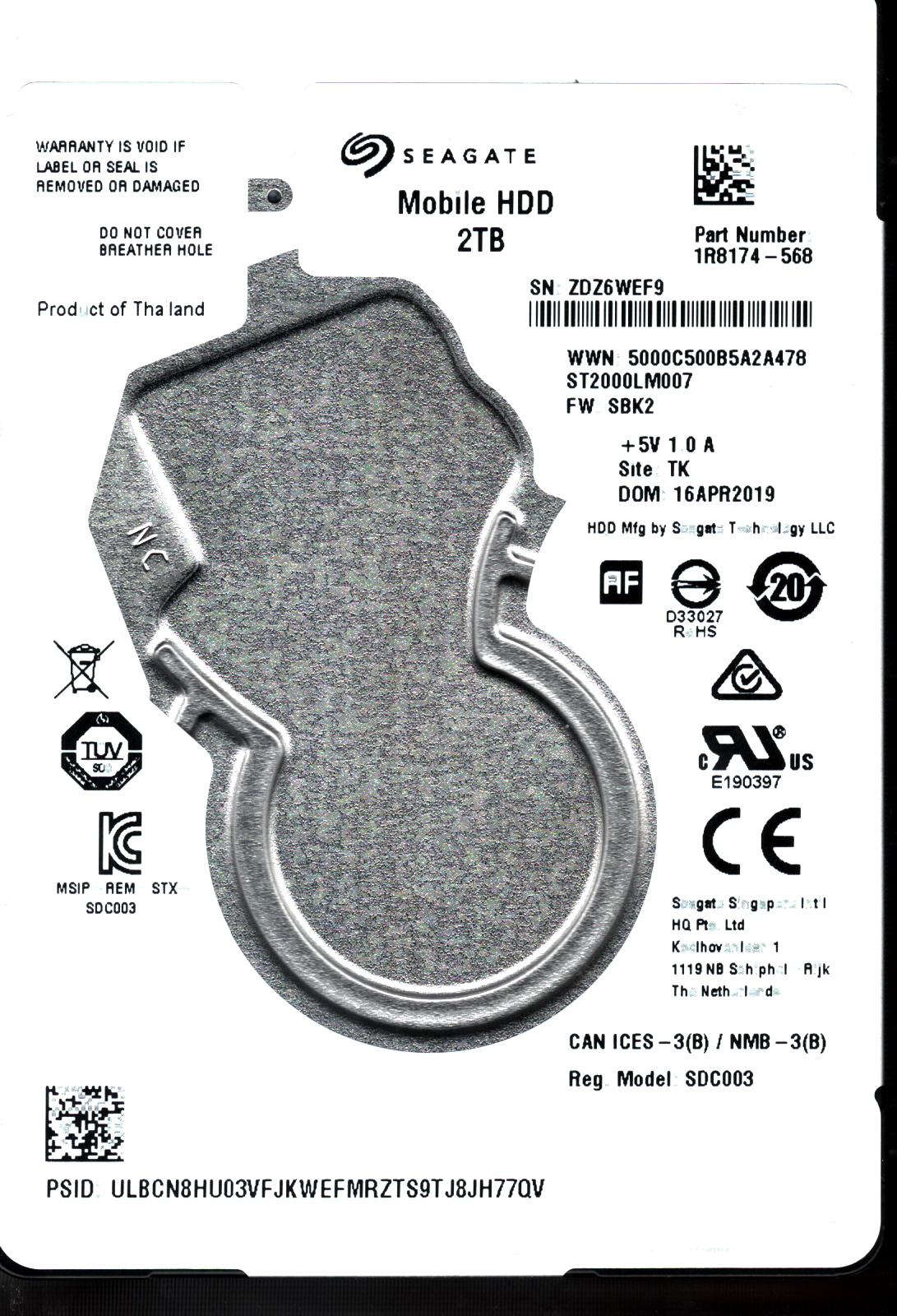Model:ST2000LM007 Capacity:2TB Serial number:WDZ396JR Date of manufacture:FEB 2017 Country of manufacture:CHINA PCB:100809471 REV A QR code:100790701 1BHHW Part number:1R8174-568 SKU:10113