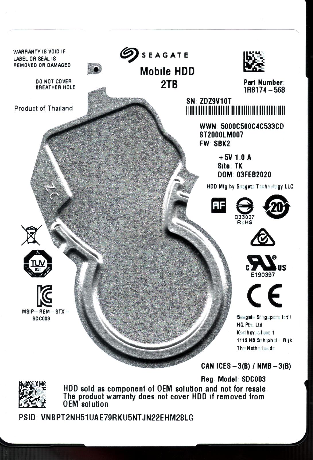 Model:WD20NMVW-11EDZS7 Country of manufacture:THAILAND Capacity:2TB Serial number:WXT1A67PRD5L DCM::HBMTJHKB Date of manufacture:JUL 2017 PCB:2060-771961-001 REV B QR code:771961-R01 SKU:10159