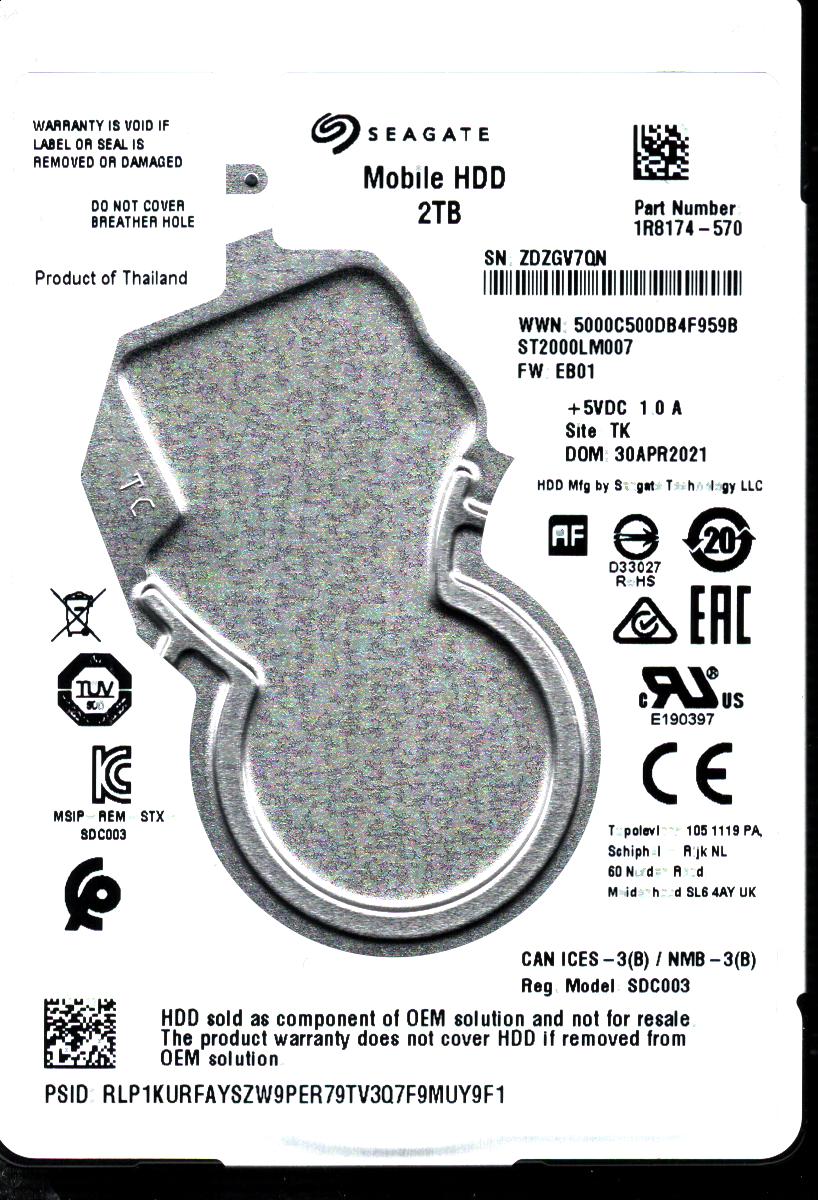 Model:ST31000520AS Country of manufacture:CHINA Capacity:1TB Serial number:5VX1XB40 Date of manufacture:06/2011 PCB: 100536501 REV C QR code:100571882 Part number:9TN154-510 SKU:10125