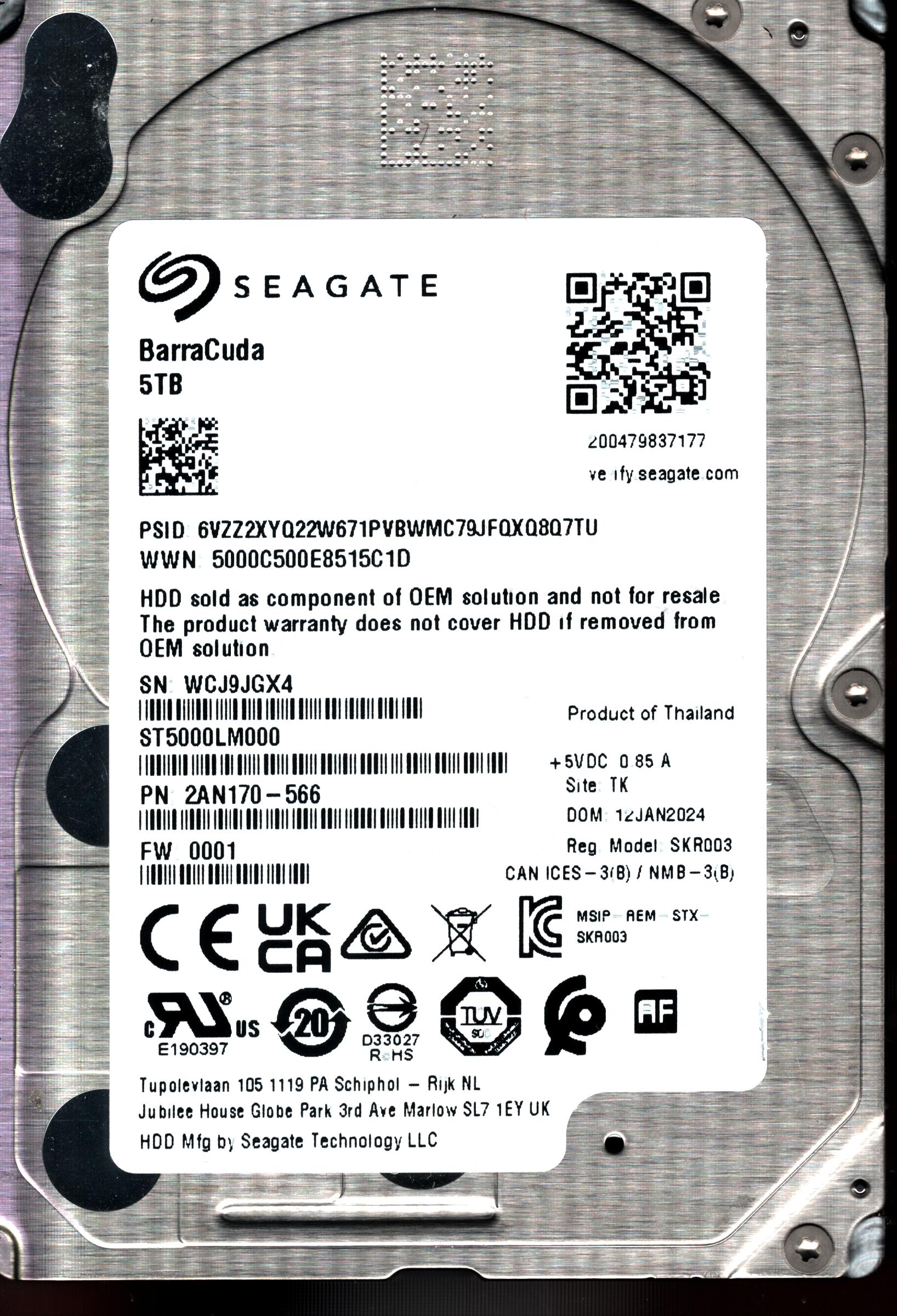 Model:ST5000DM000 Country of manufacture:CHINA Capacity:5TB Serial number:W4J035V9 Date of manufacture:08/2014 PCB:100721570 REV E QR code:100727008 Part number:1FK178-568 SKU:10110