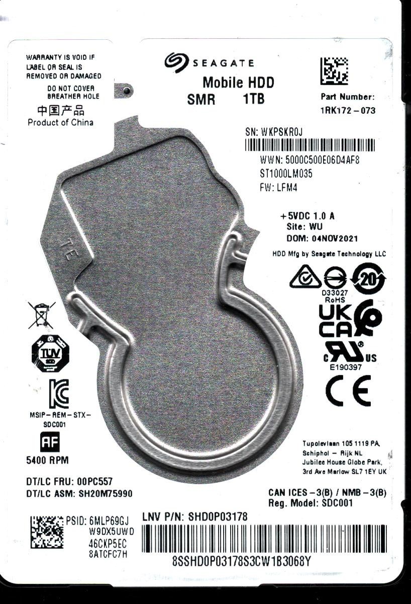 ST1000LM035 P/N: 1RK172-073 F/W: LFM4 S/N: WKPS WU 1TB NOV 2021 CHINA SEAGATE