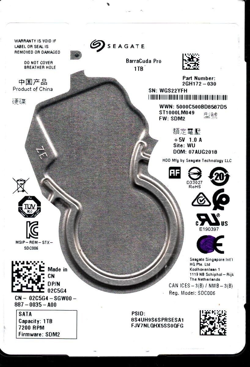 ST1000LM049 P/N: 2GH172-030 F/W: SDM2 S/N: WGS2 WU 1TB AUG 2018 CHINA SEAGATE