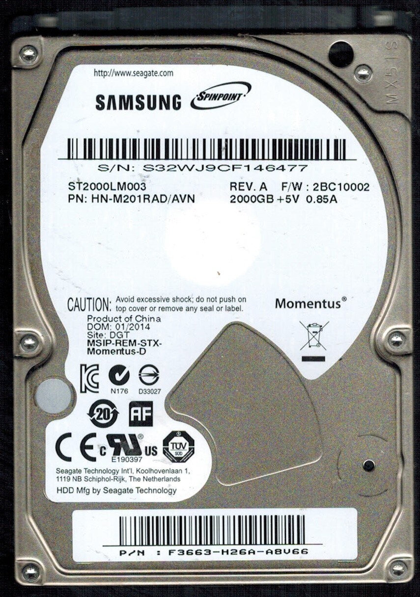 ST2000LM003 P/N: HN-M201RAD/AVN S/N: S32WJ 2BC10002 SAMSUNG 2TB CHINA JAN 2014