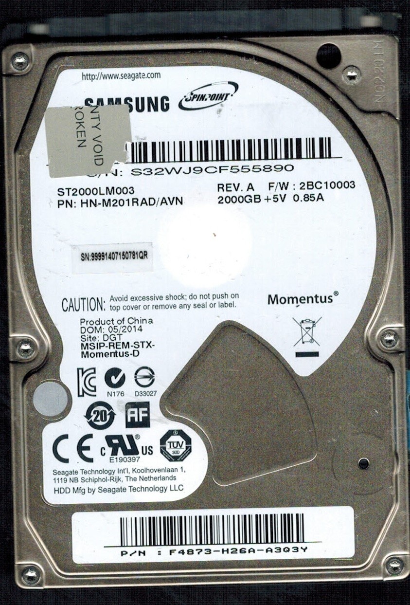 ST2000LM003 P/N: HN-M201RAD/AVN S/N: S32WJ 2BC10003 SAMSUNG 2TB CHINA MAY 2014