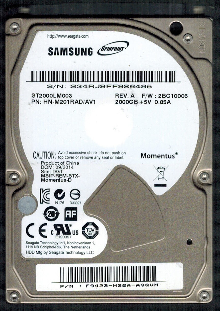 ST2000LM003 P/N:HN-M201RAD/AV1 S/N:S34RJ SAMSUNG 2TB CHINA SEP 2014
