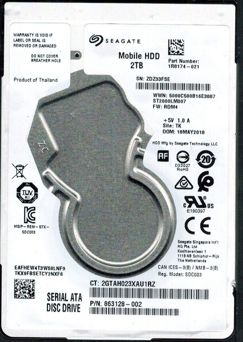 ST2000LM007 P/N: 1R8174-021 F/W: RDM4 S/N: ZDZ3 TK 2TB MAY 2018 THAILAND SEAGATE