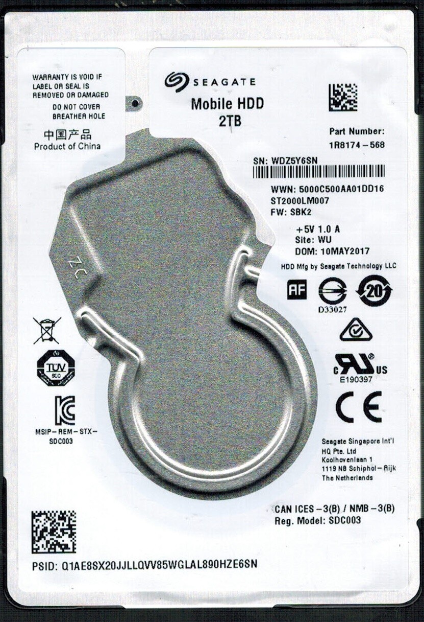 ST2000LM007 P/N: 1R8174-568 F/W: SBK2 S/N: WDZ5 WU 2TB MAY 2017 CHINA SEAGATE